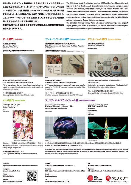 文化庁メディア芸術祭は今回で25回目を迎えた。この四半世紀の歩みはメディア芸術という新たな領域の成熟に大きく寄与してきたといえよう。今回も引き続きコロナ禍の下での審査であったが、総応募件数も3,537作品が寄せられ、ほぼ例年並みの応募数であった。公募や審査の一部をオンラインで行ってきた文化庁メディア芸術祭は、比較的スムーズにこうした事態に対処し、時代の動向に機敏かつフレキシブルに対応し続けてきた。
