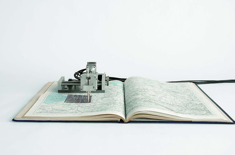 上空を通過する人工衛星の軌跡を紙の地図の上にペンで書き込んでいく装置。天空を行き来する衛星は目には見えないが、この装置は公開情報からその軌道をリアルタイムに算出する。装置の置かれた位置を基準に地図上の約10cm2の中に線を引き続け、最終的には真っ黒に塗りつぶされた正方形が完成する。文明の利器が地球を覆い隠すほどの大群で飛び交っていることを示している。