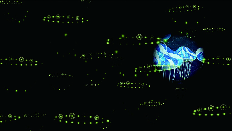 Interactive video work in which the participant wields a flashlight (actually an infrared camera) to illuminate the night sea. The imagery becomes visible only where the infrared light strikes it. Since the procedure is based on everyday actions, it requires no explanation and anyone can enjoy it. The work is full of crowd-pleasing gimmicks, such as sea creatures who flee when the light shines on them.