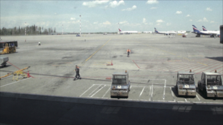 Several Aeroflot planes sit in the distance against an expansive blue sky. Occasionally one takes off. As the camera slowly pans for nearly five minutes over the ordinary scenes of an airport, the viewer is left to ponder the veracity of a strange man’s story. From the director’s brief description, all we learn is that he met the man at the airport, where he currently lives. The man seems to be one of Russia’s homeless. While reminding us that there are more and more people living in similar conditions all over the world, the man’s mutterings about his devotion to his young lover, who apparently abandoned him in a foreign land, vividly and superbly raise universal questions related to the perils and mutability of life, love, and hardship. These are issues that confront us all and extend beyond mere social issues.