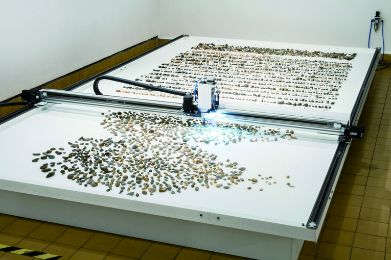 産業オートメーションと地史学をつなぐ研究プロジェクトから最初に発表された本作は、河川の小石群を地質年代で分類する装置である。小石は、ドイツのウルム市近郊でドナウ川と合流する直前のイラー(Jller)川の底から採取された。この装置は約2m×4mの台に広げた小石を、画像認識システムで自動的に捉え、あらかじめ設定された基準となる石と特徴を比較し、地質年代を推定する。次に産業用バキューム付ロボットアームにより、作業スペースを確保しながら、簡易的な分類を行ない、種類と年代順に並び替えていく。河川の小石は特徴的な組成や構造を持つため、その来歴は一定の精度で分析可能となる。イラー川における多様な地質年代の小石は大きく2つの出自を持つ。すなわちアルプス山脈での侵食から生じた岩に起源を持つものと、氷河で粉砕され、運ばれてきた岩石である。本作は小石と河川の歴史が織りなす豊かな時間の層を、無機質な機械音とともに描き出している。