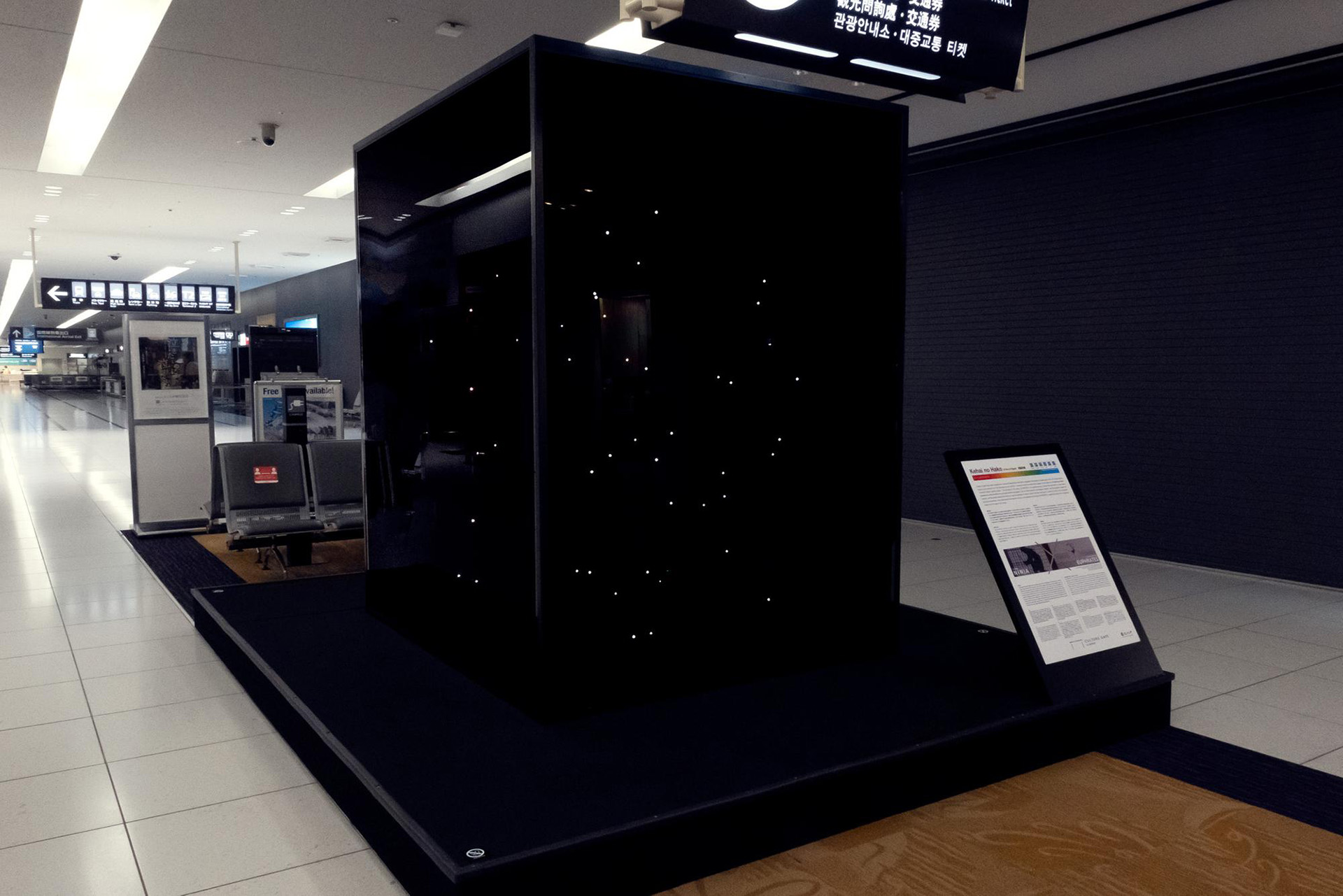 高さ約2.5mの黒い箱の中に浮かぶ、光の点群。その一部が規則性を持って動くと、鑑賞者は実物大の「人の気配」を察知する。認知心理学では、関節の位置を表す十数個の点だけで生物の動きが認知される現象「Biological motion」が明らかになっており、アニメーション作品や実用的な技術として活用されてきた。この知見を応用し展示された「気配」は見る者にある種の緊張感を与える。