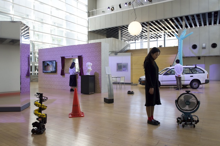 『アバターズ』では、ポストIoT時代のモノの世界を予感させる構想において、他のアーティストとは一線を画したプロジェクトを実現しようとしている。展示空間には、日常の中の大小さまざまなモノが散らばって配置されている。それぞれには移動メカニクスがしこまれており、属性によって空間内の位置や移動する方向を変えていく。 鑑賞者は、空間全体を脇から眺めて いてもよいが、ネットワークからまずこのプロジェクトに参加することが重要だ。それによって、自身がどのモノにアサインされたかは不明なまま、モノに付いたカメラ(一眼)から、偏向された世界を同時並行に解読し、様々なモノの立場から体感的にバラバラに動き回 る。この作品は、脱人間主義のモノ中心の関係世界構築という構想からすると、まだまだ未完な部分も感じさせるが、技術的達成度は非常に高度な水準を実現しており、むしろその未完部分こそがネクストビジョンへの期待を感じさせるのである。(阿部 一直)