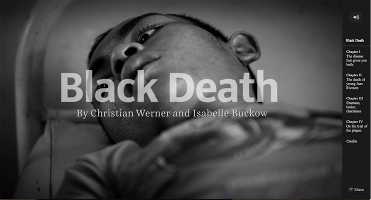 テキスト、映像、写真、音声、地図、アニメーションなどさまざまなメディアを用いて、ウェブサイト上でスクロールしながら読む、新しい形式のルポタージュである。エルシニア感染症、あるいは「黒死病(BlackDeath)」と呼ばれるペストは、歴史上の病として知られる。中世ヨーロッパにおけるペストの流行は人口を大きく減少させた。近年、ペストは衛生状態の改善や医療技術の向上により、地球上の大部分ではおおむね根絶された。それでもアフリカ、ロシア、アジア、そして米国でさえも、依然としてペストは発症しており、2009年以降、年間平均500件の症例が記録されている。複数の表現方法を用いたこの作品は、物語や情報の伝達について、シンプルながらも新しい方法を指し示している。