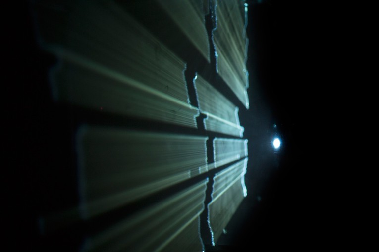 ©Martin Messier Photo: Martin Messier 第19回 アート部門 審査委員会推薦作品Boîte noire映像インスタレーションMartin MESSIER 作品概要本作は、音の視覚化をテーマに制作された。一筋の光線を透明な大型プリズムに投影して、音と光の動きに変換する作品。振動波形を伸ばしたり分解したりすることによって、音という捉えどころのない要素を実体化し、目に見える輪郭を与えている。 BACK TO AWARD LIST