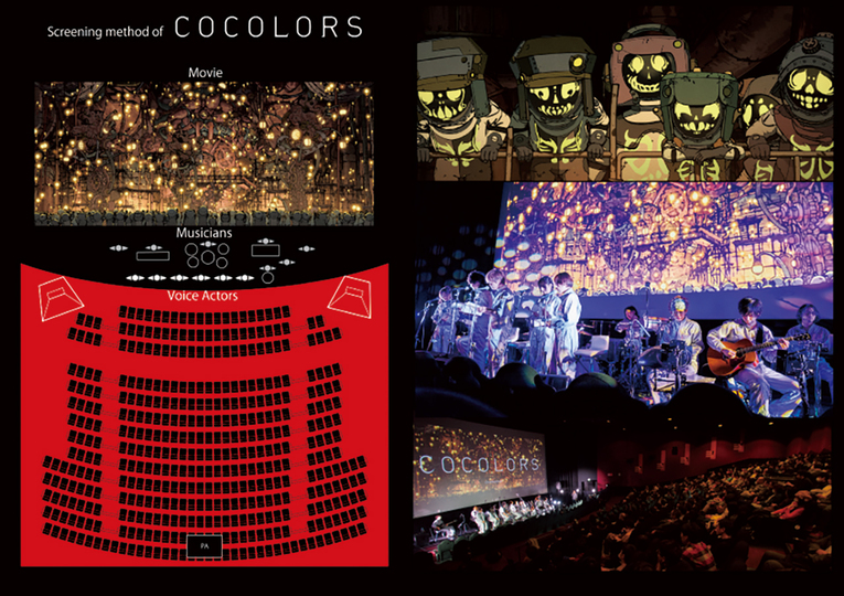 アニメーション部門優秀賞受賞作品「COCOLORS」 で試みられた上映方式。マスクで見えないキャラクターの顔「色」の手掛かりは、声「色」、音「色」、そして映像の「色」。無音の映像作品に、声優が声を、ミュージシャンが音楽をつけることで、見る人の想像力によって作品が完成される。アニメーション作品と観客がより深く繋がるアプローチを実現し、唯一無二の体験を可能にした。
