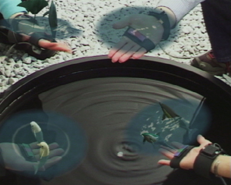 © 2000,2001 CANON INC. 第5回 デジタルアート(インタラクティブ)部門 優秀賞コンタクトウォーターインスタレーション村上 泰介 [日本] 贈賞理由眼鏡をかけてみると自分の手のひらの水たまりにイルカや魚が泳ぎ、その水を他の人の手めがけて投げると、イルカはそちらにジャンプする。現実の光景に仮想世界が融合した、夢と新鮮な驚きに満ちた作品である。アーティストの自由なイマジネーションが最先端の複合現実感技術の研究者らとの共同作業を通じて実現した。 BACK TO AWARD LIST