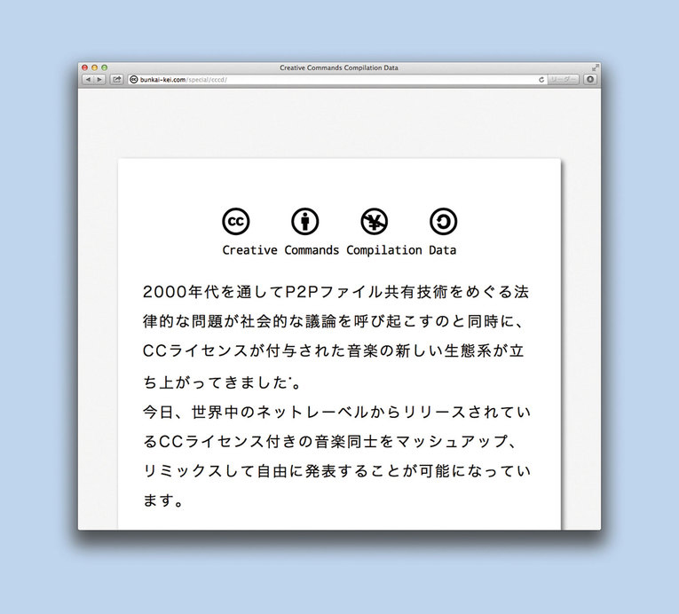 「日本でクリエイティブ・コモンズ・ライセンスにて公開されているネットレーベル楽曲を、2レーベル、3曲以上セレクトし、分解・継承して新たな作品を生み出す」というテーマで制作された7曲の新しい楽曲。これらは作家それぞれの手法で再構築された作品でありながら二次利用できる素材でもある。