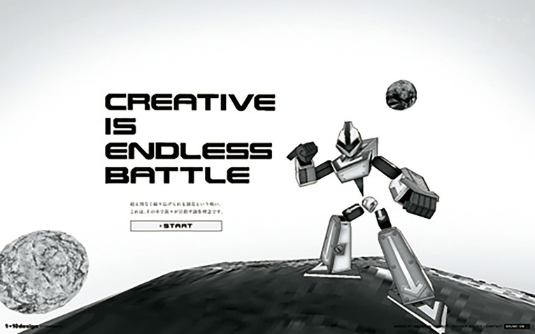 ©株式会社ワン・トゥー・テン・デザイ 第14回 エンターテインメント部門 審査委員会推薦作品CREATIVE IS ENDLESS BATTLEWeb澤邊 芳明 作品概要Webプロダクション、1-10 design の自社サイトに構築された、3D格闘ゲーム。戦いを進めるごとに会社の創作理念が画面に現れるため、ゲームを楽しみながら、会社について知ることができる。また、ゲームは高度なFlash技術を使用してつくられており、それ自体がクリエイティビティと技術のプレゼンテーションとなっている。コーポレーションサイトの新しい姿。 BACK TO AWARD LIST