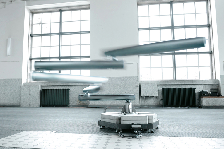 水平方向に連結した5本の筒を回転させながら、先端のスピーカーから音を発するサウンドスカルプチャー。モーターによって振り子のように動いている筒は、音源と計測器を備えた金属管。その回転運動に応じて音が反響するという仕組みだ。それぞれの振り子が描く軌跡は正確だが、予測不可能かつ魅惑的なパターンを描き出し、複合的な音を奏でている。