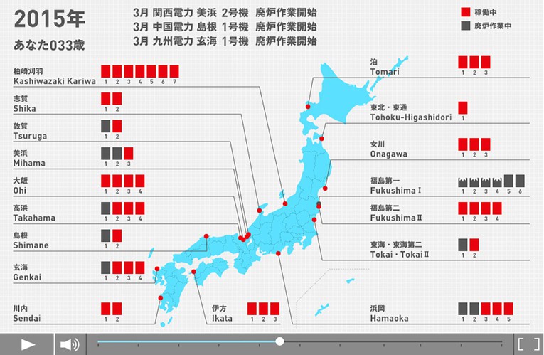 日本の商用原発の建設開始から廃炉までの経過を示すウェブ作品。新設しなければ2049年に稼働する原発はゼロになり、2079年に廃炉作業が完了する。そのときあなたは何歳だろう。原発をめぐる議論は賛否の対立に終止しがちだが、ユーザー自身の生年を入力し、互いの寿命を比較することで、すべての人に自分事としてとらえる機会を提供している。