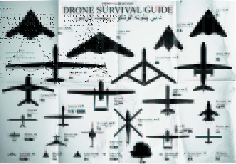 一般的に使用されているドローン(無人航空機)26種のシルエットと、それらの使用用途、国籍、そして無人航空機の偵察や攻撃から身を守るためのサバイバル・ガイドを記載したパンフレット。特設ウェブサイトからは、印刷用データと32ヵ国語に翻訳された説明資料のダウンロードや、無人航空機の監視センサーを阻害するとされる反射性のアルミ用紙への印刷が注文できる。ある報告によると2032年にはアメリカ全土の上空を飛ぶ無人航空機は30,000に上るという。スパイ活動や攻撃を目的とした無人爆撃機から、人道的支援や災害救済のための民生機など、幅広い用途に広がる無人航空機。本作は、近い将来には身近になるこの飛行体に、私たちが慣れ親しみ熟知することを目的に制作された。無人航空機が私たちの上空を飛び回ることをどのような条件で許容し、どうやって事故を回避するのか―。本作は、無人航空機に関する知識を普及し、こうした状況をより身近に議論していく必要性を示唆している。