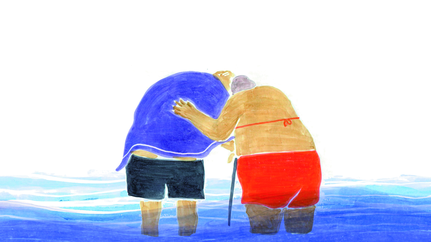 人々が日光浴や海水浴を楽しむビーチで、少女の体が冷えたことを心配する母親は、5分間水から出て座っているように言う。少女にとって無限に続くかのように感じられる退屈な5分間のなかで、年配の男女、アイスクリーム売り、浮き輪を膨らまそうとする女性などを観察しながら、頭のなかで伸び伸びとそれらを展開していく。子どもの自由な空想を水彩ペンで軽やかに描いた作品。