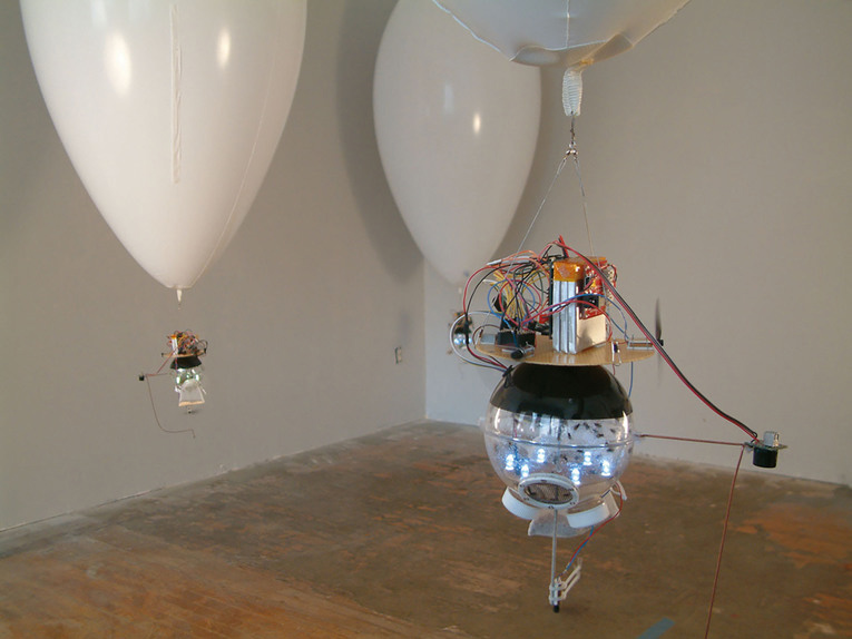 ©David Bowen 第14回 アート部門 審査委員会推薦作品fly blimpsインスタレーションDavid BOWEN 作品概要 ヘリウムを入れた3つの風船が室内をゆっくり浮遊する。風船に付いている主装置を見ると、何十匹ものイエバエがいる。実は飛行船の動きを左右しているのは、この小さな虫である。ハエの動きにより生み出される光の変化をセンサーが感知し、その情報によってプロペラに接続されたモーターが瞬時に起動する。ハエの行動様式に基づいて装置が動く仕組みだ。 BACK TO AWARD LIST