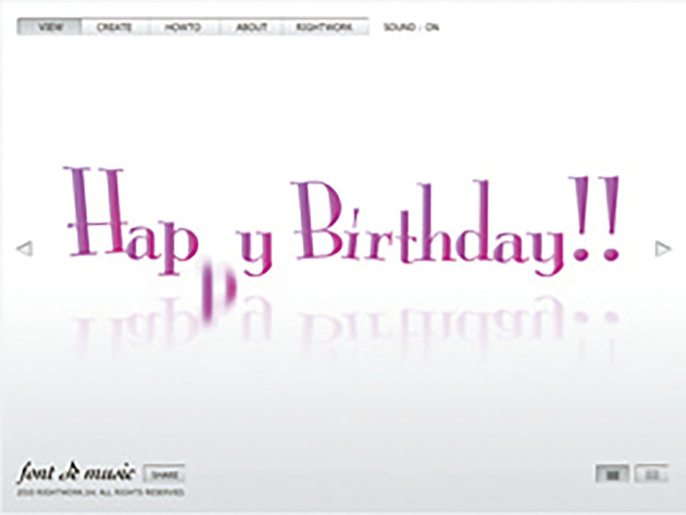 ©ライトワーク株式会社 第14回 アート部門 審査委員会推薦作品font de musicWeb西谷 睦史(RW+) 作品概要入力したアルファベットの、色や大きさ、書体などを変えると、音楽に合わせて文字が踊りだす。そのメッセージそのものに音や動きを重ねることで、意味や意思を超えた表現を可能にするインタラクティブコンテンツ。操作そのものは簡単なため、気持ちを伝えたり、意味の有無に関係なく楽しんだりすることができるコミュニケーションツールとして、発展が期待される。 BACK TO AWARD LIST