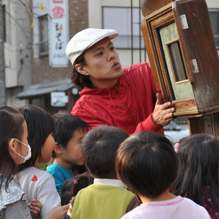 その場で撮った子どもの写真や、画像検索APIで好きな動物などの画像を取得し、テンプレートにはめ込んで紙芝居師が「語り」を付ける、即席の街頭紙芝居専用Webアプリケーション。紙芝居師である作者の長年の経験から、今後の街頭紙芝居のあり方を模索し、「インターネットを使って個人的なことを皆で楽しむ装置」をコンセプトに制作された。東京都国立市の後援のもと、実際に街頭でアプリを使用して子どもたちに駄菓子を売る「くにたち紙芝居」の活動を通して、現代版街頭紙芝居の実践を試みている。