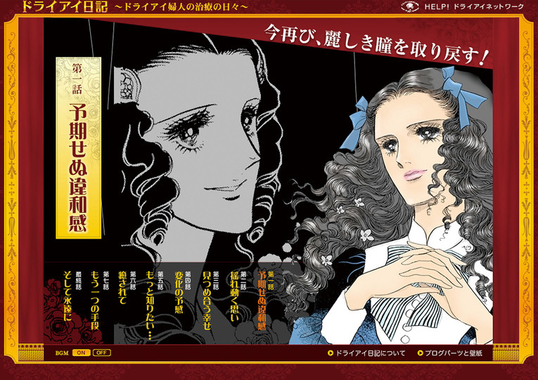 ©池田理代子プロダクション/参天製薬株式会社 第13回 マンガ部門 審査委員会推薦作品ドライアイ日記 ドライアイ婦人の治療の日々ウェブマンガ中尾 孝年(作)/池田 理代子(画) [日本] 作品概要40歳以上の女性に多いドライアイ。難解な医学的知識を彼女たちが親しんだ少女マンガの世界によって楽しくわかりやすく表現。ドライアイの目に配慮して文字に頼らないWebマンガで啓蒙した。[スタッフ:堀内弘誓、馬飼野康二、徳植篤史、八尾芳誠、甲田哲也、韓祐士、南部達彦、久保寛倫、森祐揮、松原幸子] BACK TO AWARD LIST