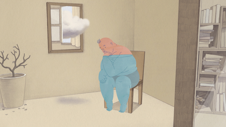 自らの存在を疑い苦悩する一人の男が椅子に座っている。記憶、空想と現実が交錯し、目の前の世界を疑っている自分自身こそが空想の産物ではないかという思いに捕らわれるようになる―。美術史を学ぶ過程で、座って思索する人間をモチーフにした絵画や彫刻に数多く出合ってきた作者はこうコメントする。“作中の「彼」は「私」が描いたものに過ぎない。では「私」も誰かに作り出されたイメージなのだろうか? ” 本作では、何世紀にもわたって多くの芸術家が「人間の存在」をテーマに、椅子に座る人間を描いてきたという発見から着想を得て、作者独自の解釈と洗練された手法で、これまでにない「椅子に座り深く思索にふける男」を描き出した。楽しげで斬新な視覚表現を用い、哲学的なタッチで展開される本作は、「我々がどこから来たのか、どこにいるのか?」そして「宇宙とは何か?」という実存主義的な問いを投げ掛ける。