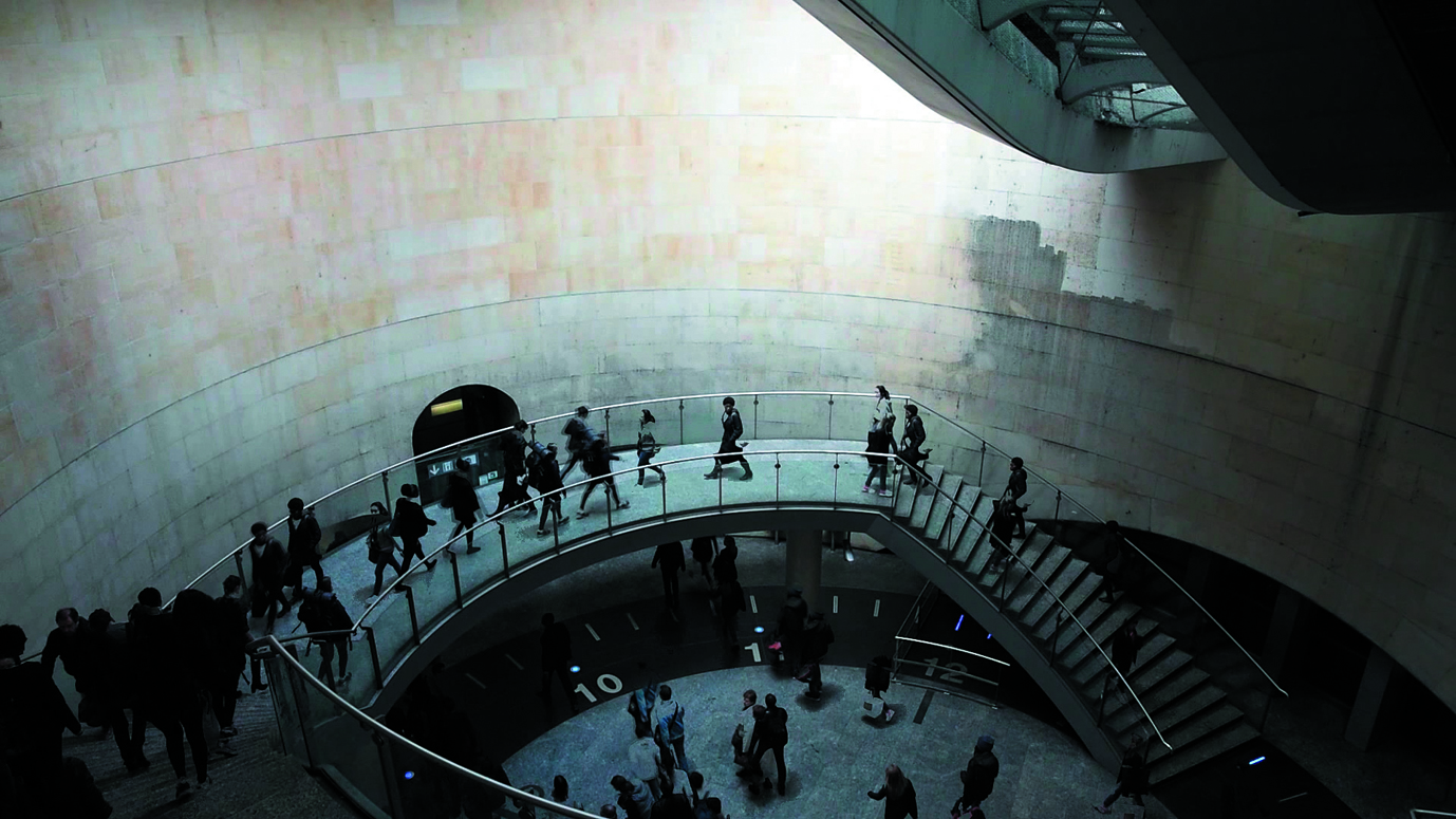 多くの人が行き交うパリのサン・ラザール駅の、吹き抜けのある階段における4分間を捉えた作品。撮影された動画から抽出された静止画が、定期的に動画の上に重ねられていく。それぞれ違う瞬間に記録された通行人の形跡をひとつの画像に融合することで、人間と、その動きをかたちづくる建築との対話を描くことを試みた作品。