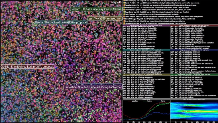 人間社会を模した進化生態系シミュレータが自動的に作り出す、高速で展開する人生ドラマを鑑賞する作品。シミュレータ内の仮想空間に存在する数千もの個体は、男性が角ばった形状、女性が丸い形状、子どもは男女それぞれの形状で小さく、そして「もの」が三角形で表現される。シミュレーション内の時間の進行は10日間を1ステップとし、人の一生は約1分半で計算され、誕生、恋愛、離別、死を繰り返す。各個体は、性別に関わらず好みの姿の遺伝子を持つ相手に求愛するが、異性カップルからしか子どもが生まれないため、異性から恋愛対象とされるような見た目に進化する。同性に恋をする個体も存在し、時には「もの」に恋をする個体も現れる。作品には個体が動き回る様子と、数個のサンプル個体の人生の出来事を記述した文章が表示される。同時に、発話合成を使ってそれらを読み上げ、産声、男女の音声による求愛の言葉、そして葬送の鐘の音が重なった効果音とともにスピーカから出力される。無機質でロジカルなシミュレーションによって、私たちが営む人生のサイクルを客観的に見ることができる。