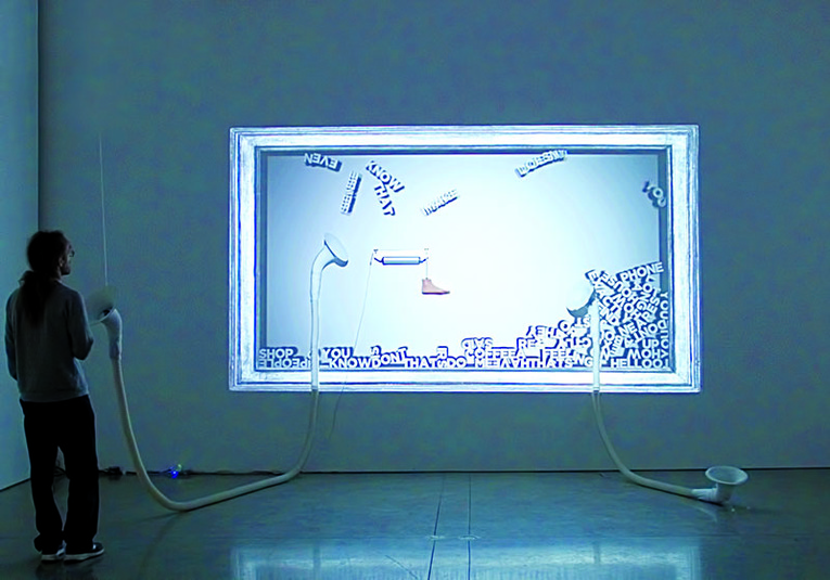 自動応答機との会話など、人と機械の奇妙な関係や言語についてシュールに捉えなおすインスタレーション。プロジェクション技術とロボット工学を使ってバーチャルと現実を結びつけている。人が話した言葉が次々とスクリーンの中の世界で文字に変換され、溜まっていく。時折、機械の足が文字を蹴ったり文字が機械音声によって現実世界に音として吐き出されたりする。