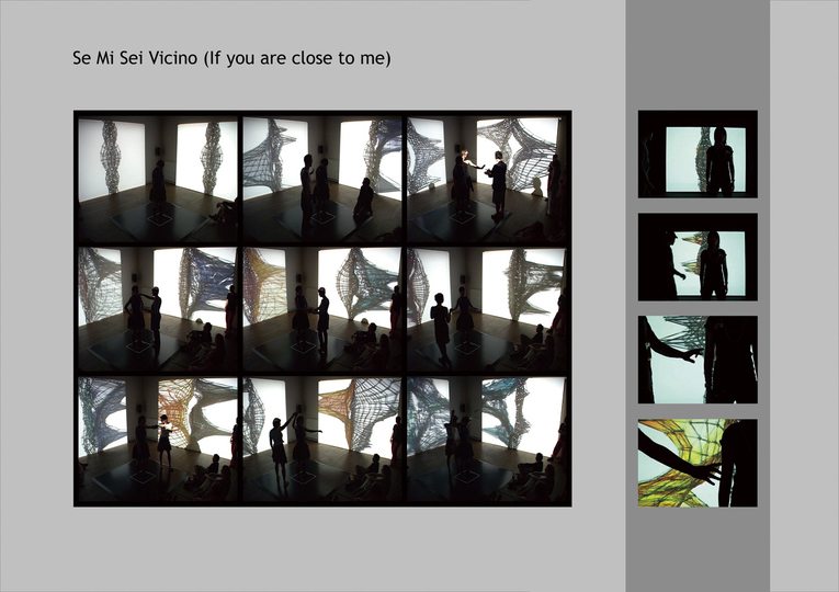 センサーを内蔵したフロアにパフォーマーが立ち、アンテナの役割をする。体験者がパフォーマーに触れたり近づいたりすることでスクリーンに映し出されたCG映像とサウンドが変化するインタラクティブ作品。パフォーマーの身体感覚を目の当たりにしているようだ。