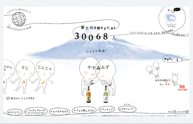 ©高橋 昌也 第13回 エンターテインメント部門 審査委員会推薦作品しりとりで人のわを広げよう!shiritori-ringWeb阿部 晶人/望月 かおり [日本] 作品概要オンライン上に居合わせた誰かとしりとりをして、うまくつながれば焼酎をお酌して手をつないでいく。つながった人の輪で、富士山やピラミッドなど、世界中の名所旧跡を囲む。コミュニケーションが希薄になってきた現代の若者に、お酒を介して人と人がつながる楽しさを感じてもらうことが目的である。 BACK TO AWARD LIST