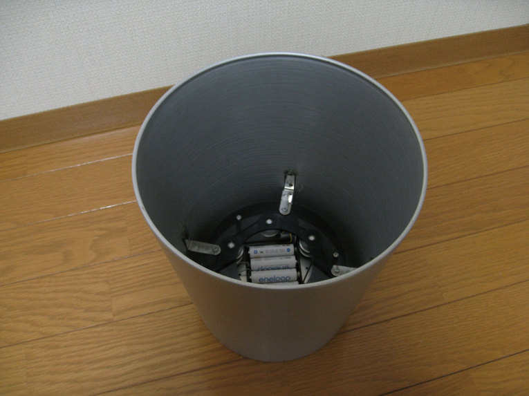 ゴミを投げるとゴミ箱自ら動いてキャッチしてくれる『勝手に入るゴミ箱』。壁に備え付けられたセンサーが投げられたゴミを検知して落下位置を予測。ゴミ箱はその情報を無線で受け取り、本体の底に設けられた車輪を回転させ、自ら移動してゴミをキャッチする。ゴミの検知にはゲームのモーションキャプチャなどに用いられるセンサーを応用し、ゴミの位置情報から運動軌跡を計算することによって落下位置を予測する。またBluetoothによる無線通信、車輪を正確にコントロールする制御回路や、コンパクトかつ力強い動きを生み出す独自の駆動メカニズムなど、種々の技術を融合させることによって実現している。見た目はただのゴミ箱だが、ひとたびゴミを見つけると動き出す未来のゴミ箱と言える。