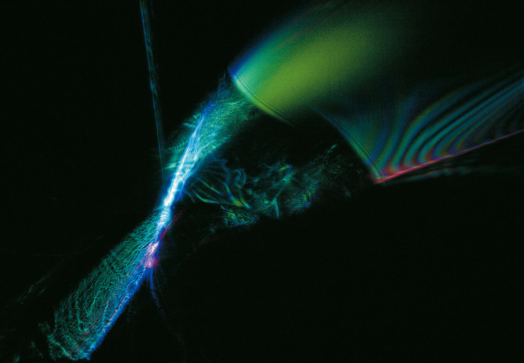 レーザーが石鹸の泡の塊の表面をスキャンすると、濃い彩色を施した分子相互作用の球面投影と非線形光学の圧倒されるような事象が映し出される。レーザーの焦点ビームは泡の表面を縫ってゆっくり進む。光を閉じ込める導波管アンテナの役目を果たすそれらの光の軌跡は、レーザー発光によって固まったり引き伸ばされたりする。