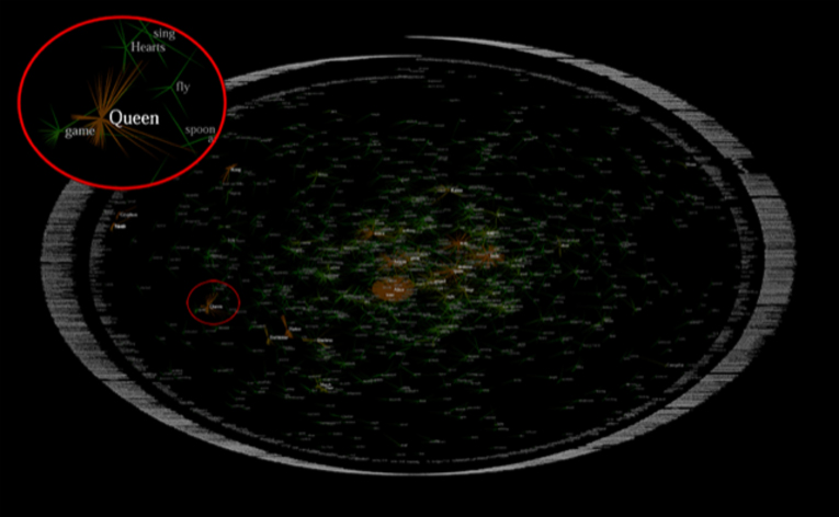 個人的な心象風景の多いデジタルの静止画の分野の中では、異色の作品であった。『不思議の国』のアリスの全文が、大きな楕円形に、可読できる最小の文字で印刷されている。その楕円の内側には使用頻度に従って文字級数の変えられた言葉が描かれている。当然主人公である「Alice」や「King」といった文字が見えるが、それらの大きさは使用された文字の場所からできるだけ等距離の場所に表示されるので、全編に渡って出現するものほど中央に表示されることになる。これは極めて知的な分析の結果をグラフィックとして定着させたもので、コンピュータを利用することによってのみ可能になった表現であり、また同時に、グラフィックとしても楽しめるものである。