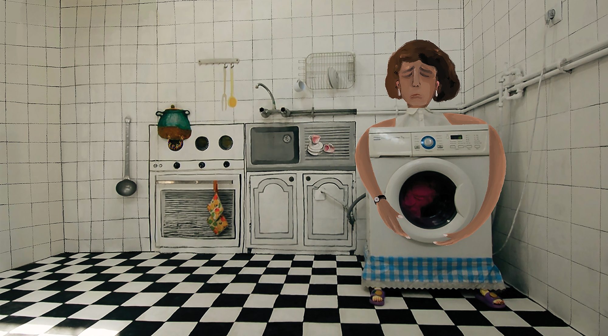 生活空間としての家や家族の関係性を創造的に再構成した「台所」を舞台とする実験的な短編アニメーション。洗濯機と一体化した母親、冷蔵庫と一体化した父親、生まれたばかりの赤ん坊、そして吃音症の少年自身を登場人物とする本作では、台所という狭い空間の中で繰り広げられる家族についての物語が、少年の視点から語られる。平面に描かれた台所設備や実写の洗濯機や冷蔵庫に、ストップモーション・アニメーションや2Dアニメーションなどの技法が組み合わされた独特な表現手法は、まず場面のなかでアニメーション化する要素をデザイン、配置し、カメラを動かしながらそれらの要素を撮影、最後に映像に絵を挿入する、という3つの工程を重ねることで生み出される。複数の技法を組み合わせることで技法同士の境界が溶け合い、均一な性質を持った映像がつくられている。次々と場面の転変する物語が自在なカメラワークで臨場感豊かに表現され、鑑賞者は現実と想像のあいだの曖昧な境界線に立たされる。