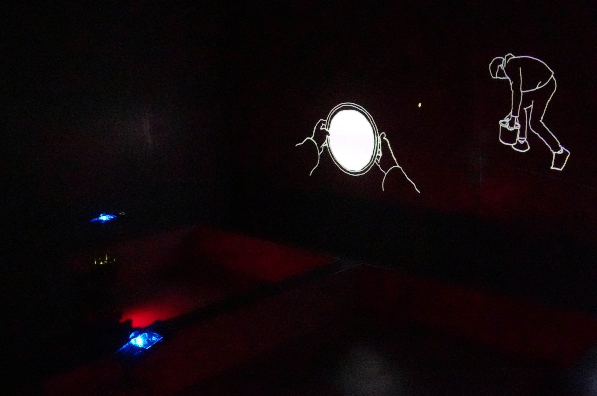 個人的な記憶に基づく短編アニメーションを、小型のレーザープロジェクターとロボットを用いることによって、新たな形式による上映を試みた作品。2台のロボットは、部屋をあちこち行き交いながら揺らめき、像を投影する。映像のタイミングに合わせて、ロボットが動き出す。白線の手描きのアニメーションは、プロジェクターの特性からぼうっと壁面に浮かび上がり、振付のごとく振る舞う。ぼけては動き、電池が絶えるまで灯し続けるぎこちない映像は、幻燈や写し絵を連想させ、メディア考古学的な観点も示唆する。これらの構造的、文脈的操作によって、鑑賞者の眼前にアニメーションが「いる」感覚をもたらすことを試みる。