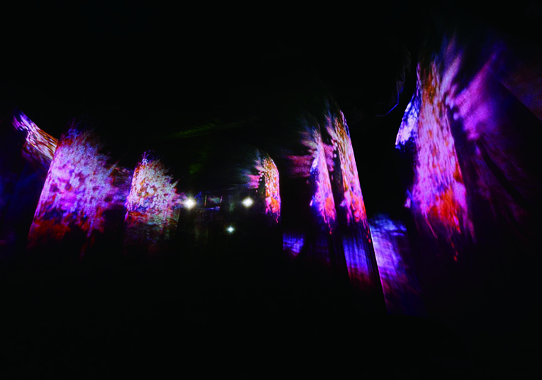 重なり合う透過スクリーンが描く螺旋が舞台の体験型作品。中心の映像は4方向から投影されており鮮明だが、回廊を彩る映像は所々ぼやけ、歪み、まるで幻影のようである。それらは断片化した記憶の一部として表現されており、鑑賞者が中央に向かうあいだ、拾い集めるごとにイメージの輪郭が明確になる。記憶と想起を巡るマルチプロジェクション映像インスタレーション。
