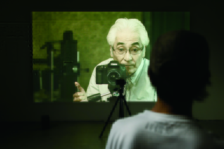 ©2014 Koki Sone All Rights Reserved. 第18回 アート部門 審査委員会推薦作品写場インタラクティブアート曽根 光揮 作品概要本作は短編映画の手法と、「カメラ」をインタラクションを生む装置として用いたインスタレーション作品。カメラマン役の男性が映画の中でシャッターを切ると、展示空間に設置されたカメラが鑑賞者を撮影する。その直後、鑑賞者の姿が写った写真が、映画の中で取り出される。鑑賞者は、自分と映画の人物との関係が捏造(ねつぞう)されてゆくさまを目撃する。 BACK TO AWARD LIST