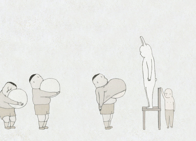 かつてわれわれは自分たちとは違う、崇高で深遠で神秘的な存在を「グレート」を付けて呼んでいた。それはまさにグレートで、その存在を信じる者と信じられる世界がひとつであった。時代は進み思考や思想がそれまでのものと変わり、ついには信じられていたものが信じられなくなった今、いまだにグレートと呼ばれ続けるその存在のグレートたる由縁は何なのか。Sacrebleu Productions(仏)とCaRTebLaNChe(仏)の共同製作で「不服従」をテーマに制作された作品。大きなタマを抱え一列に並ぶ子どもたち。そのタマにそっと手を添えていくウサギのような人型の生き物とそれを見守る眼鏡の幼児。タマを狙うテンのような動物と子どもの服を奪っていく鳥。そして神棚に祀られ何かを食べ続けるウサギ。0.3mmの細い線と淡く抑えた色味でこれらの登場人物や背景を描き、服従しないこととはどういうことなのかを表現した。