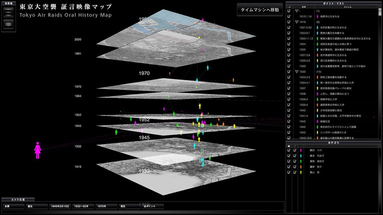 時代の異なる8層の地図で表わされた変容する東京の都市空間と、その上にプロットされた東京大空襲体験者の証言映像を重ね合わせながら視聴できる映像アーカイブ。3D地図のような客観的な歴史のイメージと、体験者が物語る主観的な歴史のイメージを、直感的な操作によって行き来しながら視聴することで、空襲体験者の人生を、多方向から追体験することができる。