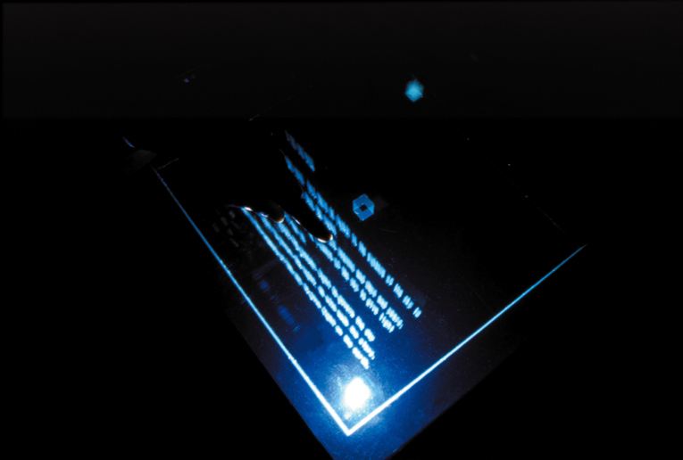 上面照射と下面照射により水面に浮かび上がる凹凸のある立体的なテキストを手によって触覚的にナビゲートしていく作品である。下から上に投影された光の映像は水面を通り抜け、天井にもうひとつの世界を作り出す。画面テキストは水面に触れるまで待機状態にあり、指で触れた瞬間に揺らいでいた線が収縮し、次の頁がめくられる。身体が重力からは逃れられないように、方向性と密接な関係を持つ。この作品空間が持つ上下左右の方向性は、観客のインタラクションに対応した空間と身体の静寂なダイアローグ環境を作り出している。