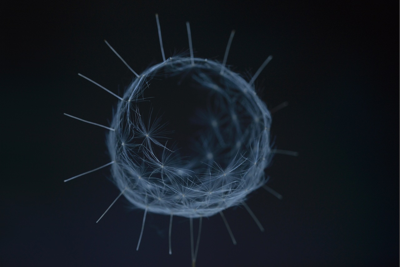 電気などの人工的な原動力ではなく、自然発生した動力を使ったインタラクティブインスタレーション。タンポポの綿毛を水に浸けしずく型に変形させたものや、加工していない綿毛をモジュールとし、水のりで接着し再構成する。手のひらに乗せても感知できない重さの綿毛は、風を起こさずとも鑑賞者の動きや呼吸にも反応して揺れる。鑑賞者はそれにより、わずかな大気の流れが起きていることを認識できる。タンポポの綿毛は、周りの環境を利用して種を飛ばす生存戦略をとり、目的に特化した軽さや形状を獲得、どんなに世の中が移り変わっても毎年芽を出す。ゆったりと佇み生きる植物の世界に引き込まれた作者は、派手なテクノロジー表現とその急速な進化に引けを取らない新しい表現を、タンポポの綿毛に求めた。