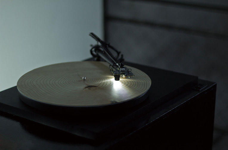 ©Bartholomäus Traubeck 第16回 アート部門 審査委員会推薦作品YearsメディアインスタレーションBartholomäus TRAUBEC 作品概要『Years』は、アームに搭載したカメラでレコードとして取りつけた木の年輪を読む、特殊なレコード・プレーヤーである。読み込まれたデータはコンピュータを経由してピアノ曲へと生成される。木盤を取り換えれば、カエデやモミ、クルミ、オークなど、さまざまな種類の木が生み出す曲を体験することができる。 BACK TO AWARD LIST