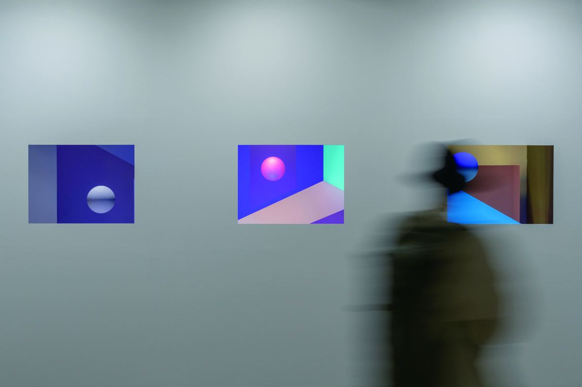 Consisting of three rectangular cut-outs on the wall and seven objects placed in the space behind the wall and viewed through the openings. Uniform lighting and processed edges diminish the sense of distance, adding a picture-like vibe to the objects, which are individually illuminated with constantly-changing colors. This work gives viewers the experience of crossing the border of the 3D space and the 2D artwork.