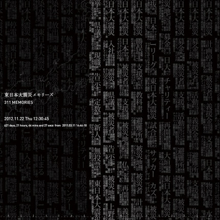 This web-based work used natural-language processing to analyze some 270,000 news articles that followed the Great East Japan Earthquake and re-edit the flow of post-3.11 time into a “quietly moving timeline.” The passive viewing/listening mode, which leaves operations up to the system, revives memories from that time period through chance encounters with keywords selected from the sutra-like flow of characters.