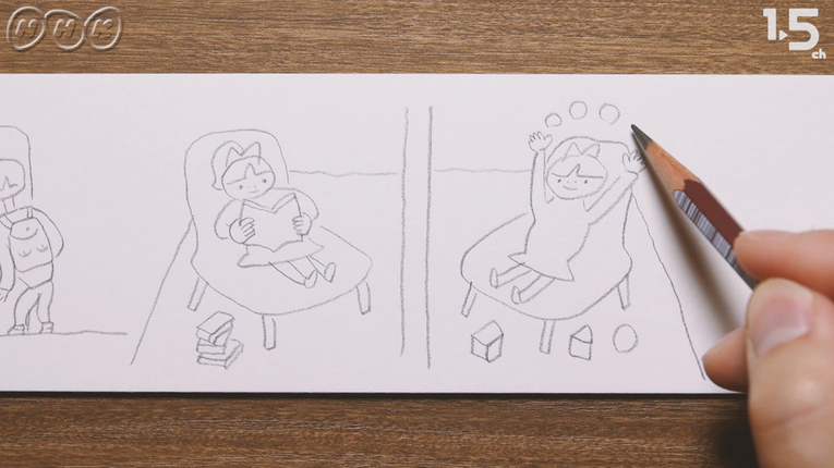 The writer of spirited short-short stories, TAMA- RU Masatomo, authored this video work, which uses the NHK program on space, COSMIC FRONT☆NEXT as subject matter. While a well- known illustrator draws pictures live as the story progresses, the narrative is read aloud by KA- MIKI Ryunosuke and KIKUCHI Akiko, to music provided by KUBOTA Wataru. This innovative, space-themed picture scroll rolls story, art, nar- ration, and music into one.
