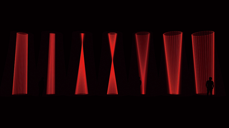 Audio visual installation with sound and seven spinning motorized laser mounted on rotating bars. As the bars spin, the straight-line laser beams spread into a cylinder and cone-shaped sculptures. The inclination and position of the laser changes the geometry.