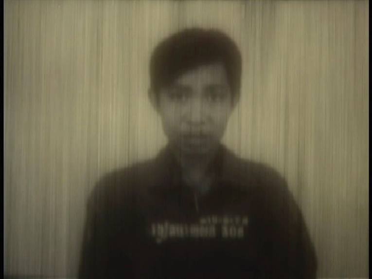 88 from 14,000 is based on mug-shots of 88 out of the 14,000 people killed at the Tuol Sleng Prison during the Khmer Rouge regime in Cambodia. The artist identified 88 photographs for which the dates of incarceration and execution could be established. Each image is projected onto a veil of falling sand.