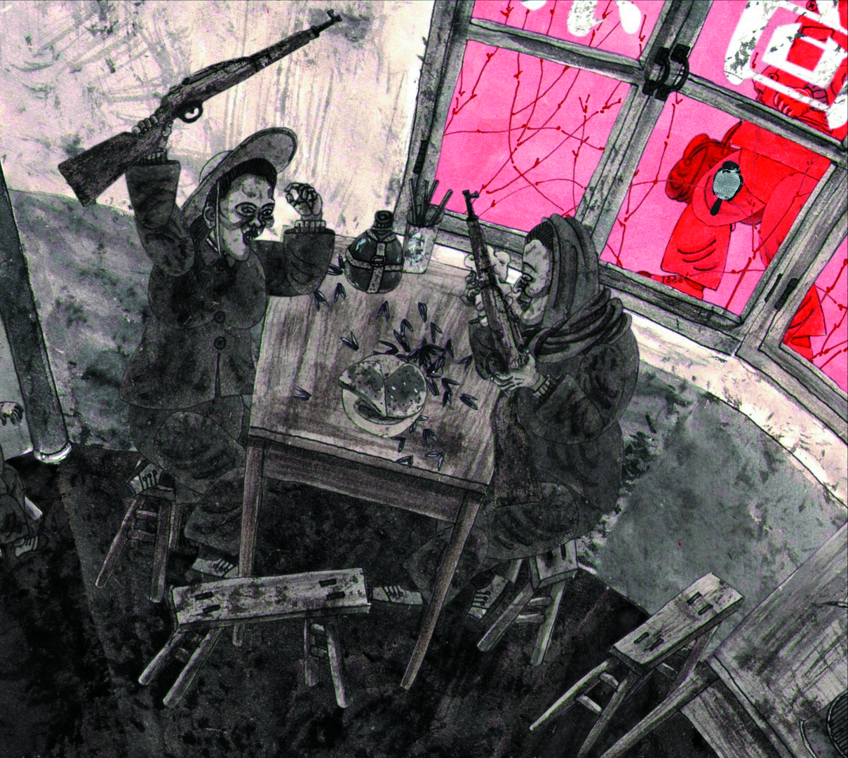 In a restaurant in China in 1970s after the Cul- tural Revolution, waiters try to swat flies while a number of diners eat their food. On the wall, a quote by Mao Tse Tung, “A revolution is not a dinner party”, is placed. At the end, however, a fly stops on the letter “not” which is knocked off by a fly flap. Using only black and red, the work takes a caricatural look on the way diners are eating and talking.