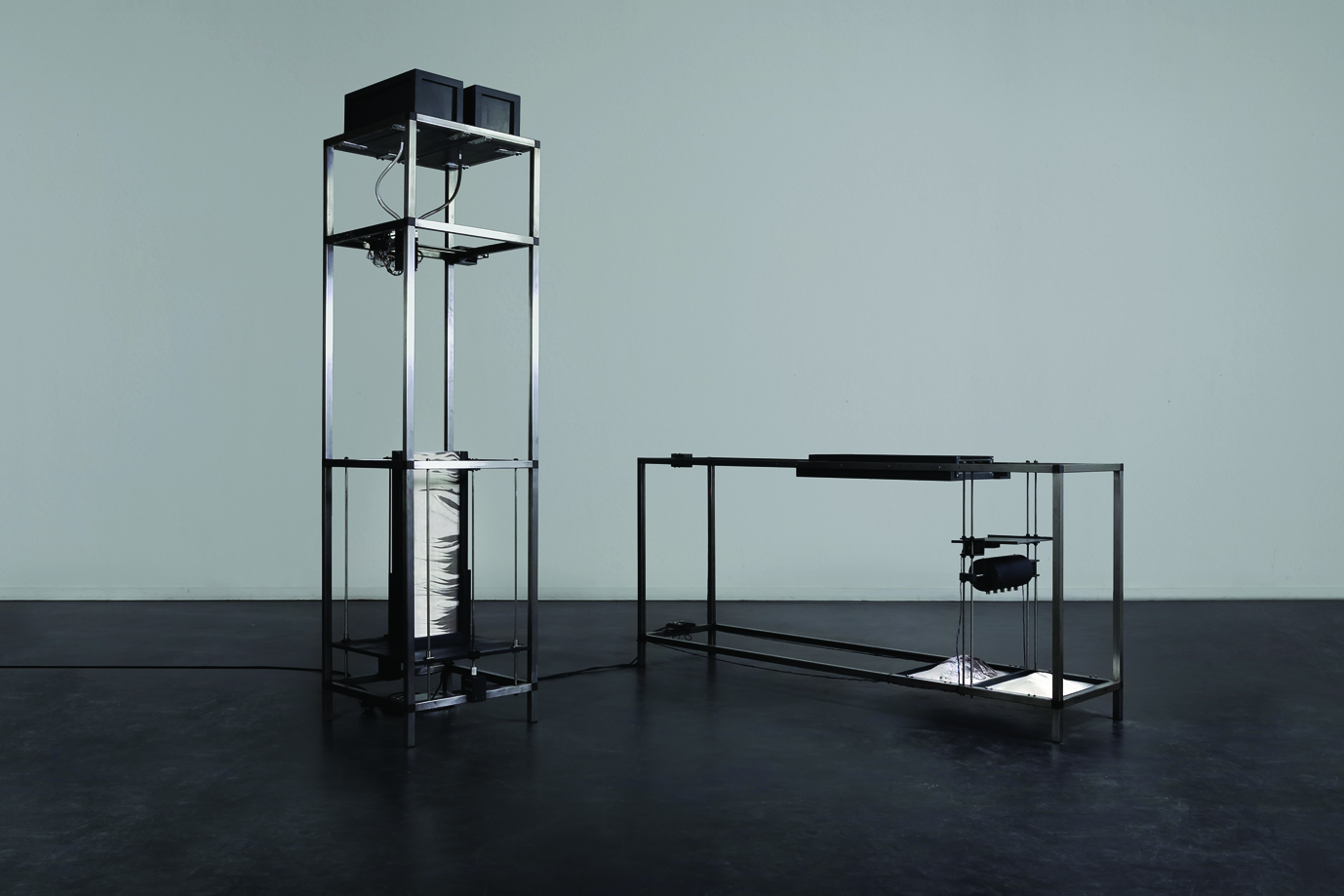 An installation consisting of two machines that read and write granular mineral ores of silica and iron. The reading machine magnetically sorts silica and iron while measuring their weights. The writing machine sediments the granules linearly according to the read digital values. When the two end simultaneously, the read ore and written ore are manually ex- changed and the process continues.