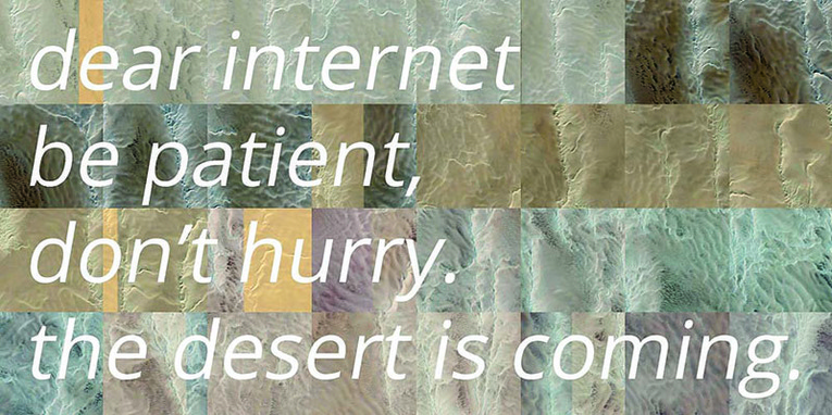 An ongoing Web project to reconstruct a picture of the entire Sahara Desert on a Tumblr blog. The artist programmed an Internet bot to transfer partial images of the desert from Google Maps every 30 minutes. It will still take approximately 50 years to cover the vast desert, and whether Google or Tumblr will exist then is a mystery. This is a project about Internet content, emptiness, time, storage, memory, oblivion, and ultimately, failure.