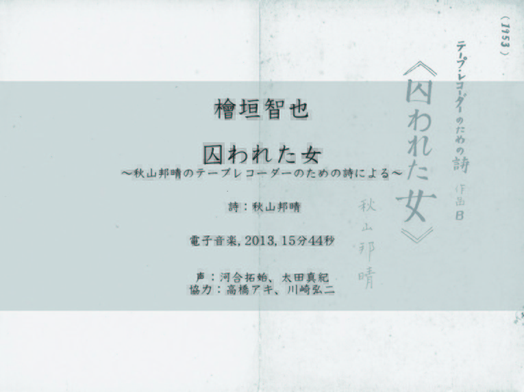 An electro-musical score created from a poem by AKIYAMA Kuniharu – an artist belonging to Jikken Kobo, an avant-garde art group – that formed part of A Woman Imprisoned, a mixed-media work including poetry produced in 1953. Composed mainly of stereo sound, this work was created with the objective of re-evaluating the gaze of pioneers in electronic music who explored new forms of representation using recording and playback technology.