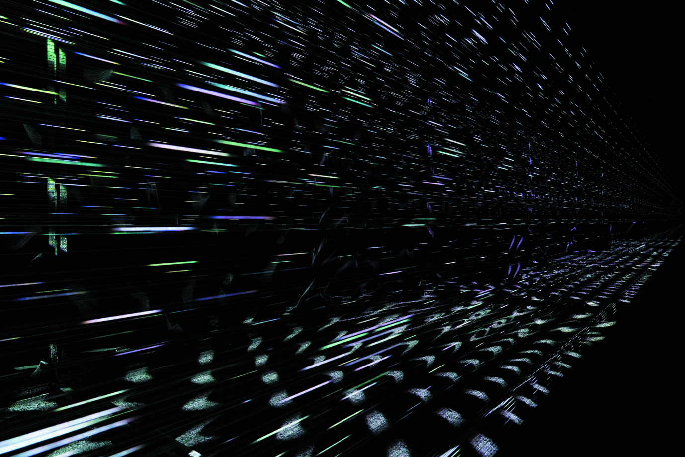 An installation that offers an immersive experi- ence where sounds travel around the body, thanks to spatial production combining 3D sound and light. Sound instantly jumps from cityscapes to forests to the ocean to outer space. Sounds generated by Sonic Surf VR’s wavefront synthesis technology dart to and fro through a 15 meter-long corridor of 576 speak- ers, and light designs are projected on a screen fitted with 576 strings.