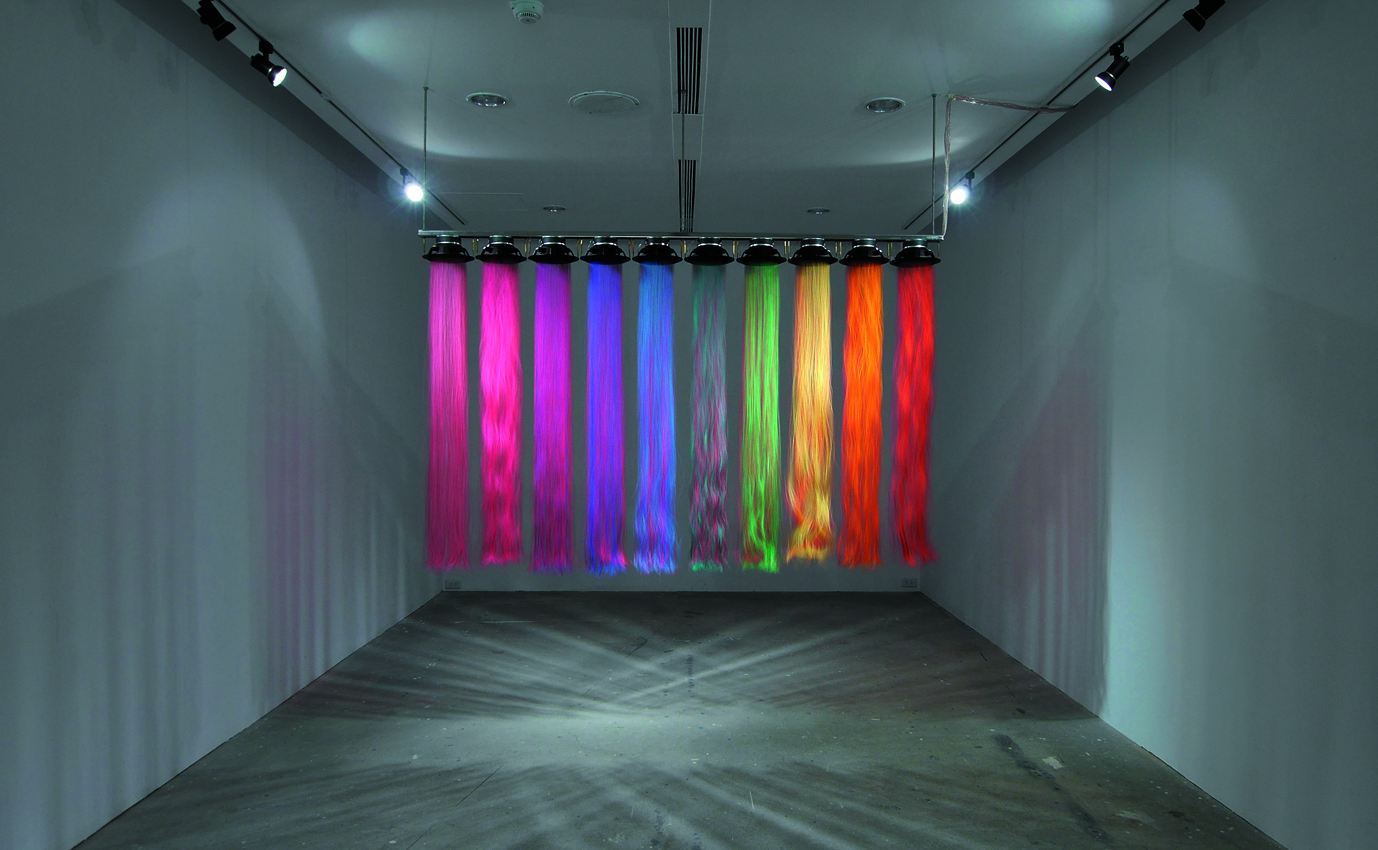 Ten different people’s sampled pulses morph threads dangling from speakers into various forms. While separate pulses are distinguish- able near a speaker, from a distance they resound as a singular mass. Making the dis- crete and the collective perceptible, the piece expresses the similarities between social struc- tures and individual needs. The visibility it brings to the human pulse acts to invite cultural discussion.